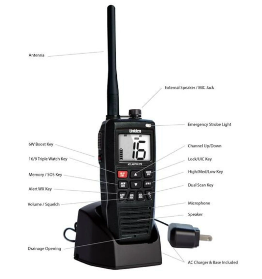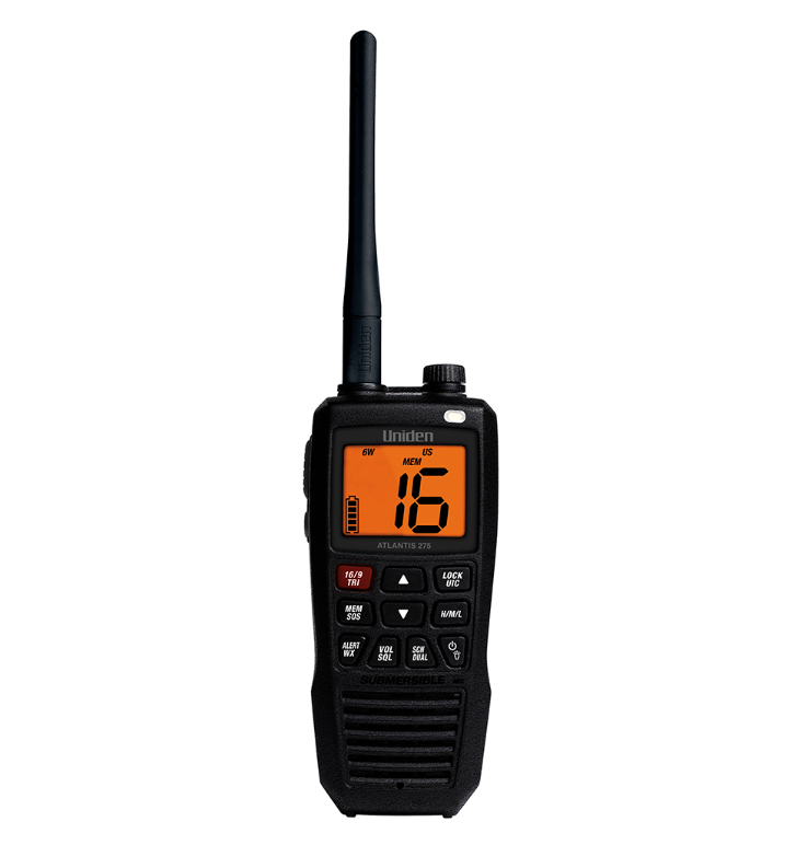 The Uniden Atlantis 275 features all NOAA emergency weather channels, as well as all USA, International and Canadian marine channels. It also meets IPX8 submersible waterproof standards. The Atlantis 275 has the largest LCD in its class and makes it easy to use, day or night for the power to go anywhere.
